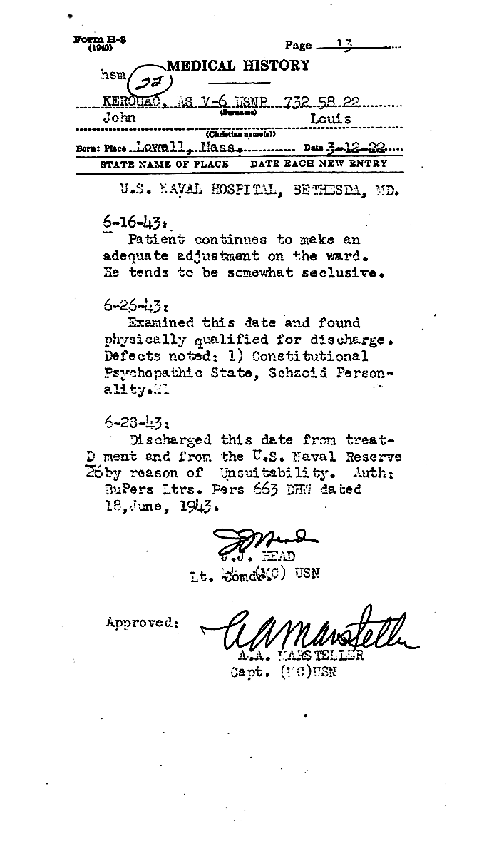 I medici militari fecero ricoverare Kerouac, poi gli imposero un periodo di