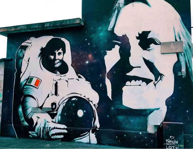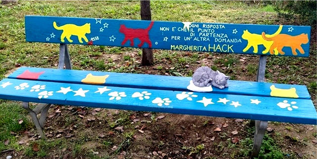 omaggio a margherita hack - settimo torinese Stelle e gatti dai colori vivaci su uno sfondo azzurro panchina disegnata dal prof. Emilio Gigliotti beatrice spagnolo - ehabitat.it - 2022 |